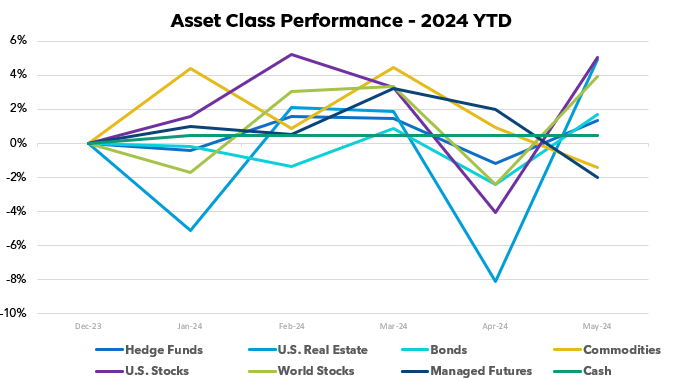 In May, most asset classes rebounded after April’s pullback:
