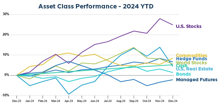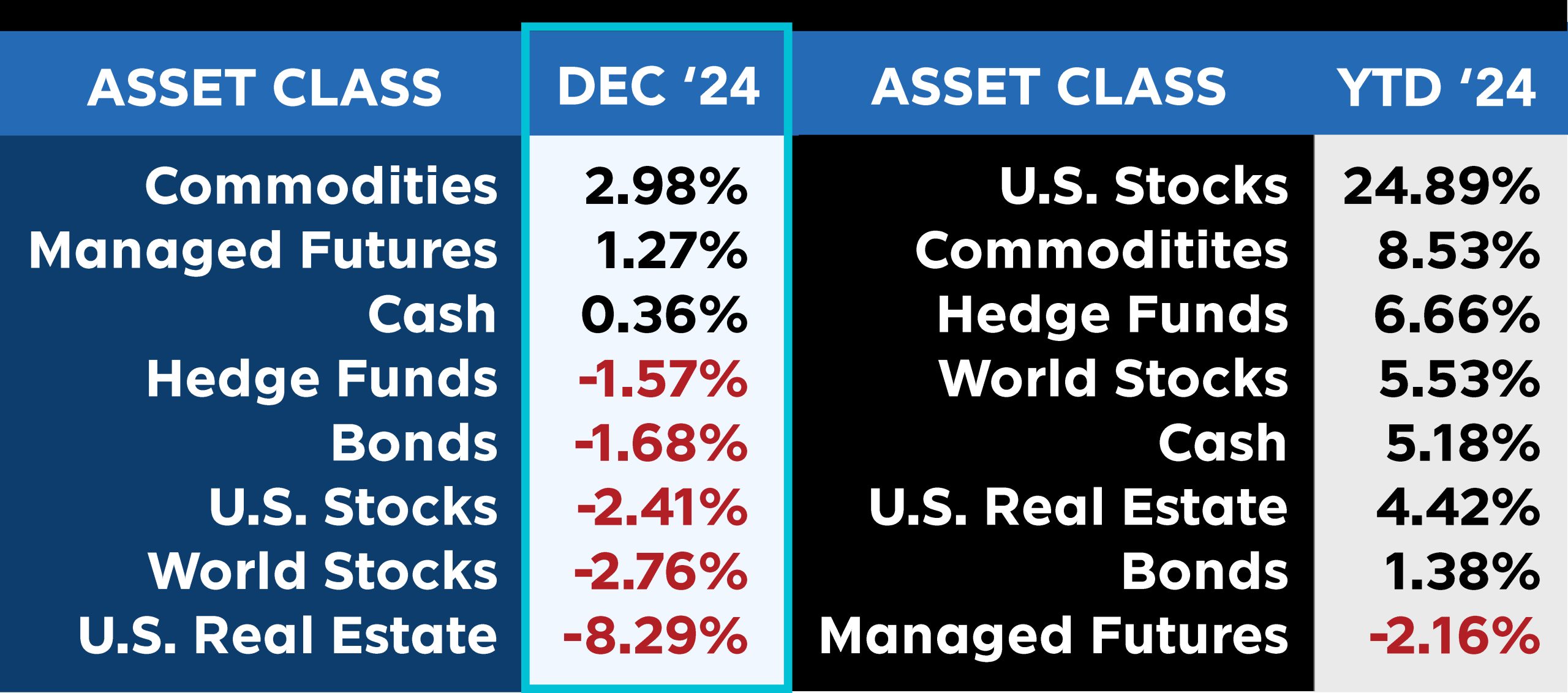 As the final whistle blew on December 2024, the asset class scoreboard showed a tough month for most players, with only a few bright spots. Managed Futures showed some resilience, posting a solid gain of +1.27% in December, although that was mainly a bounce back from a down month in November. Elsewhere, most other asset classes struggled to stay afloat. Commodities also managed to finish in the green with a +2.98% gain, recovering from November losses. However, the rest of the field faltered, with U.S. Real Estate taking a particularly hard hit, dropping -8.29% as interest rates spiked, and U.S. Stocks and World Stocks losing -2.41% and -2.76%, respectively.