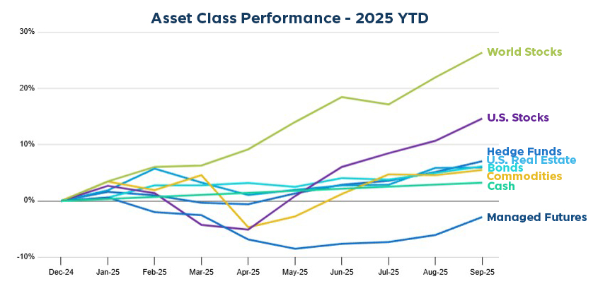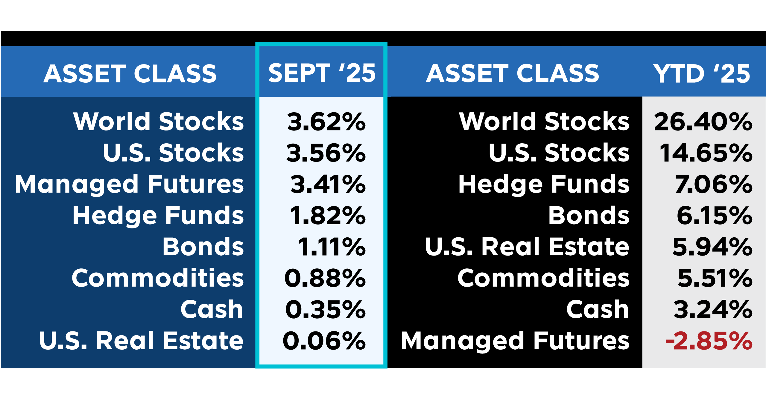 September 2025 delivered another strong month across most asset classes, with World Stocks gaining +3.62% and U.S. Stocks posting a solid +3.56% return. The continued strength pushed World Stocks to an impressive +26.40% year-to-date performance.