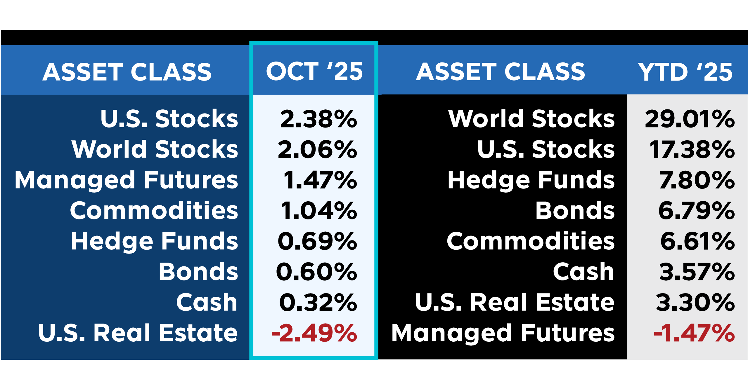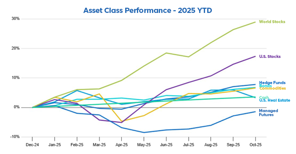 October 2025 kicked off the fourth quarter with solid momentum across most asset classes. U.S. Stocks advanced+2.38% and World Stocks rose+2.06%. These gains pushed year-to-date returns to impressive levels, with U.S. Stocks up +17.38% and World Stocks leading all assets at +29.01%.